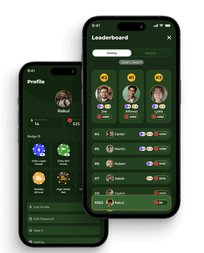 Stack your chips, earn champion badges, and dominate Weekly and Monthly competitions.